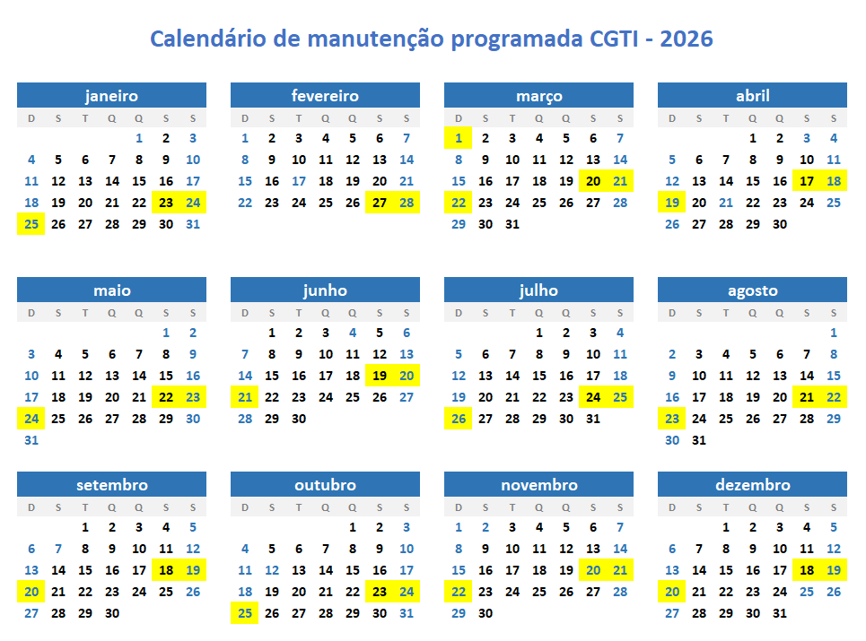 Calendários das janelas de manutenção dos recursos (aplicativos, sistemas ou infraestrutura) de tecnologia da informação e comunicação do Instituto. Estas manutenções podem afetar a disponibilidade dos serviços eletrônicos nas datas indicadas, sempre entre as 20h da sexta-feira e as 20h do domingo.